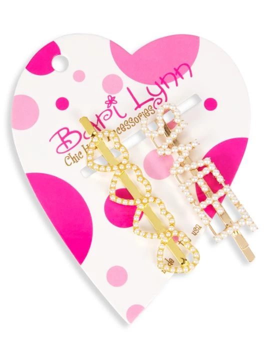 This two-pack of crystal-embellished hair clips features one with four hearts and another featuring the word “SWEET.”