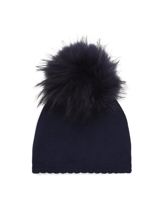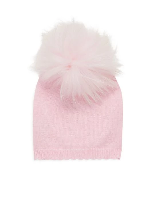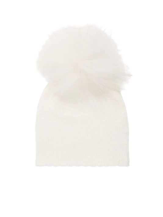 A dyed fox fur puff tops this sweet knit cotton hat, trimmed with scalloped edging.