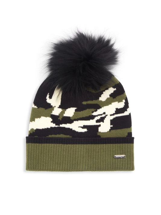 A rib-knit beanie in a camouflage intarsia pattern is adorned with a fox fur pom-pom on the top.