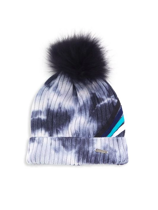 This rib-knit beanie is adorned with a tie-dye pattern and fox fur pom-pom.
