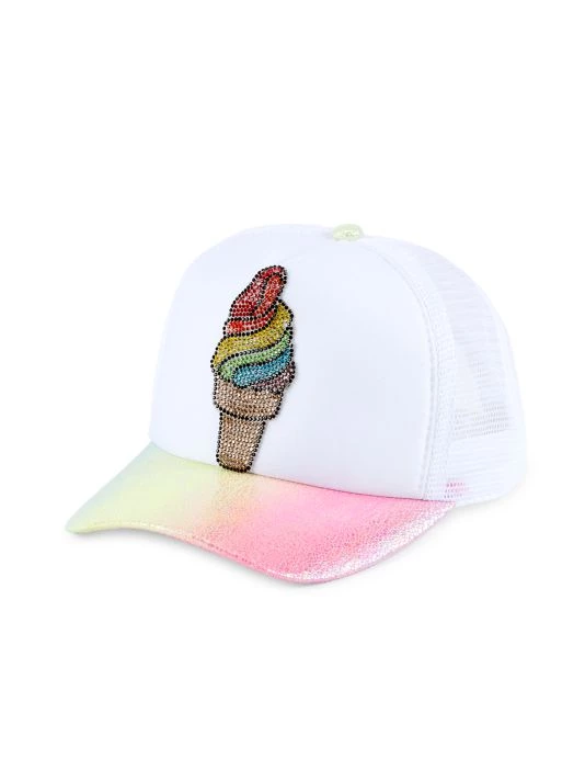 Bari Lynn’s whimsical cap features a gradient design at the cap and an embellished ice cream cone.