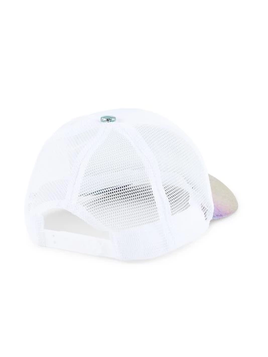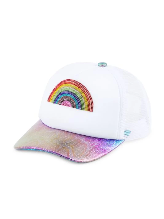 This trucker hat features a snake-embossed iridescent brim and crystal-embellished rainbow emoji on the front.
