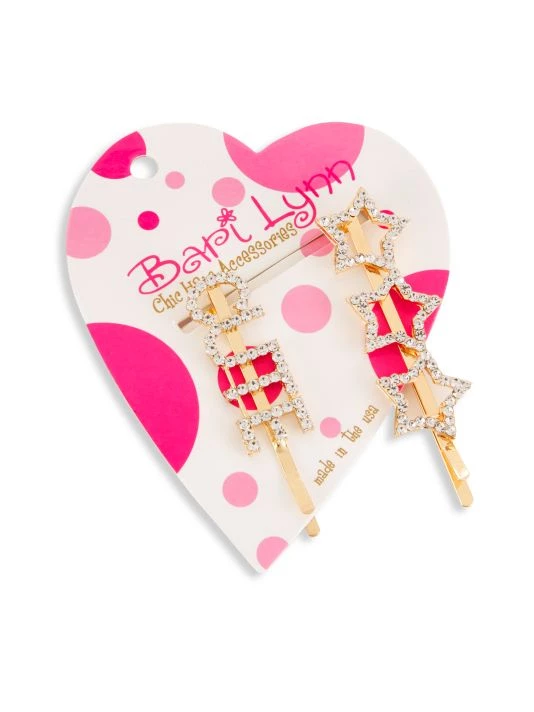 This two-pack set of hair clips features a star motif and “CUTE” adorned with crystals.