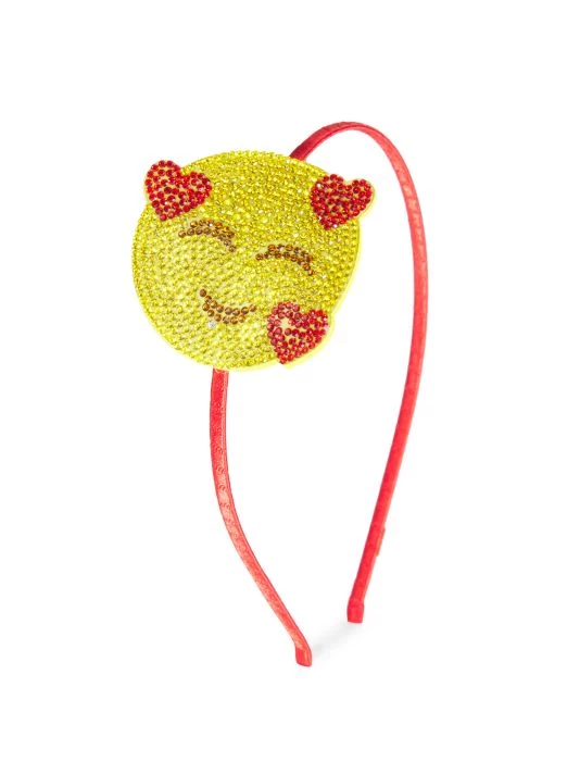 A satin wrapped aluminum headband styled with a crystal embellished smiley face and hearts.