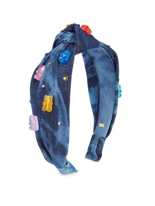 This denim knotted headband is adorned with multicolor crystal and gummy bear embellishments.