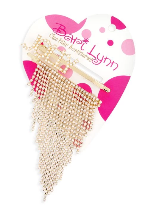 These two hair clips include a “Jolly” clip adorned with faux pearl embellishments and a cascading chain clip with faux pearl embellishments.