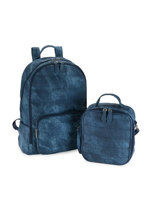 This set includes a quilted acid wash-style denim backpack with a separate computer compartment and a lunchbox included, with drink pockets. Polyurethane/polyester/nylon/aluminum. Imported.