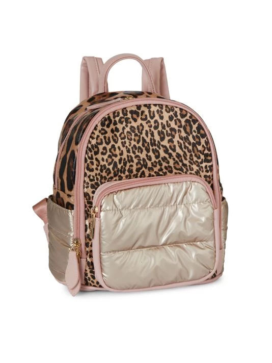 Adorable mini backpack with a trendy leopard print design and quilted metallic detailing.