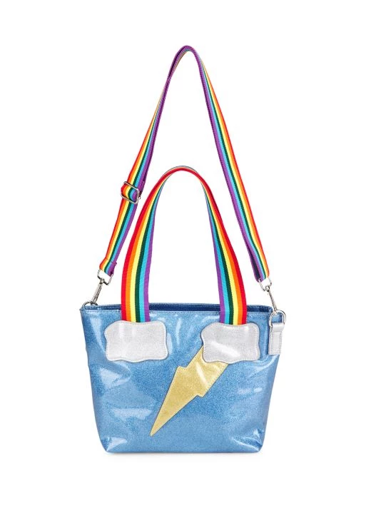 Featuring a rainbow design at the handles and strap, Bari Lynn’s whimsical bag showcases embroidered clouds and lightning.