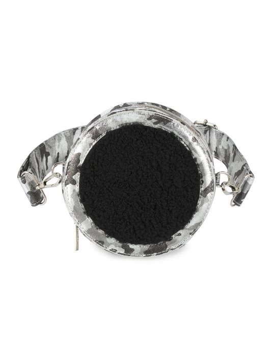 This circular-shaped belt bag is in a sherpa finish is upgraded with a metallic camouflage pattern.