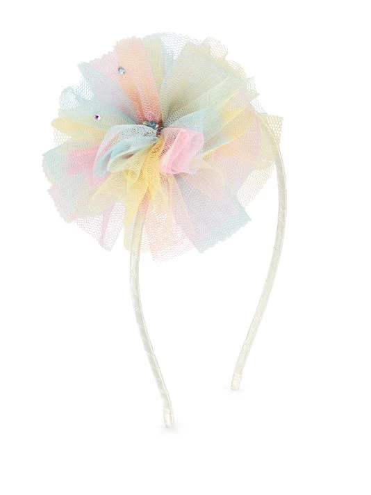 Crystals lend shine to this tulle headband, designed with ombré coloring and shaped like a puff flower.