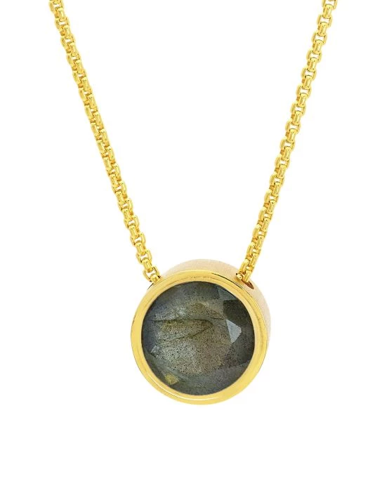 Mystical labradorite pendant is suspended from a fine box link chain.