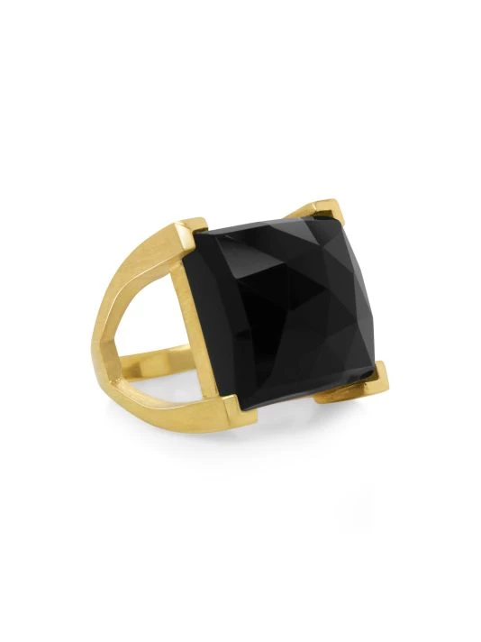 From the DD Icons Collection. This 22K gold ring features architectural lines punctuated by a substantial cushion-cut black onyx gemstone.
