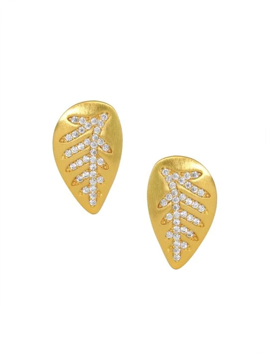 From the Origins Collection. Made of brushed 22K gold-plated metal, these exquisite leaf-shaped stud earrings are lined with delicate rows of pavé crystal quartz.
